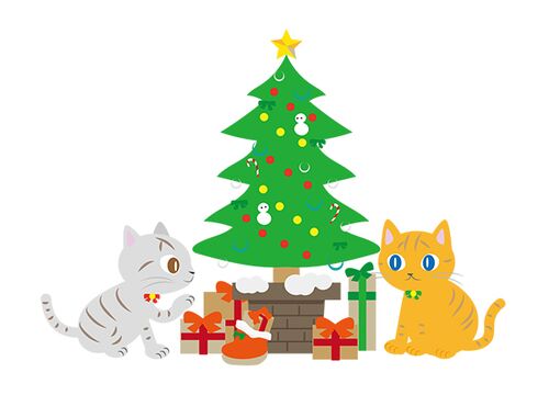 クリスマスツリーと猫のイラスト。 大きいツリーとプレゼントと猫2匹。